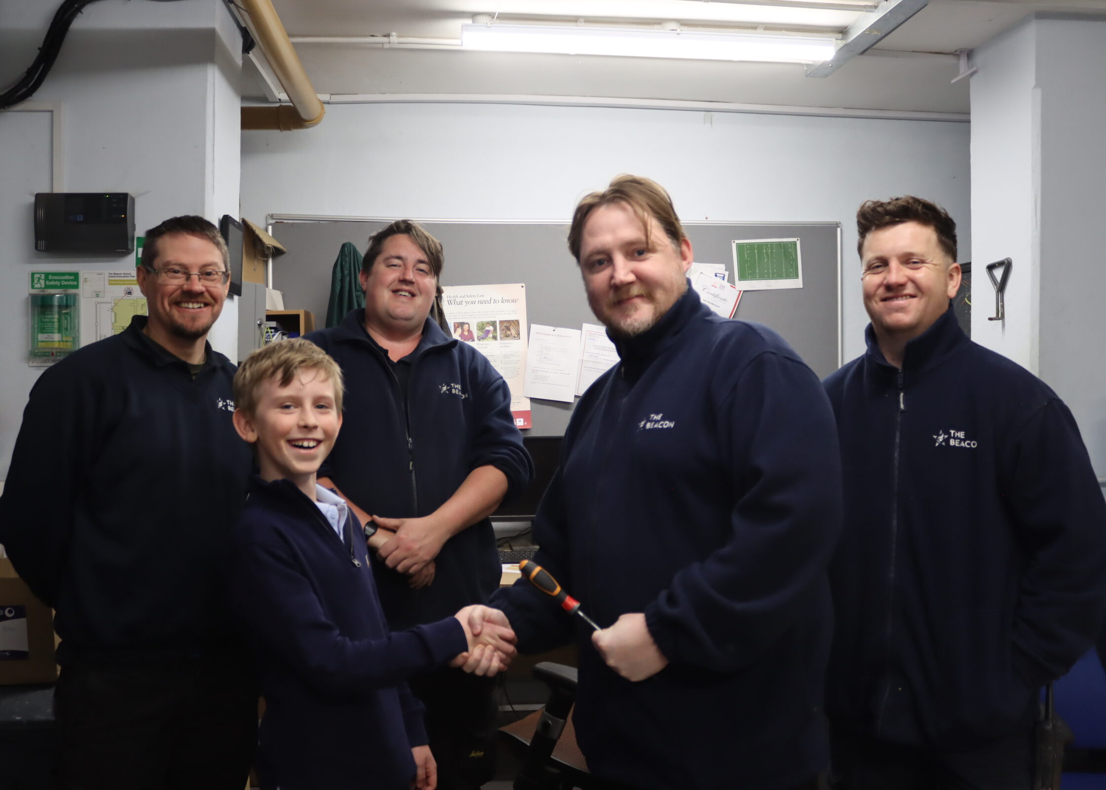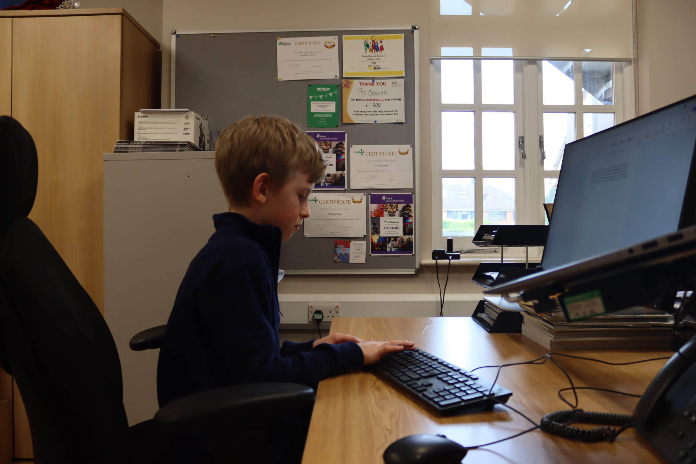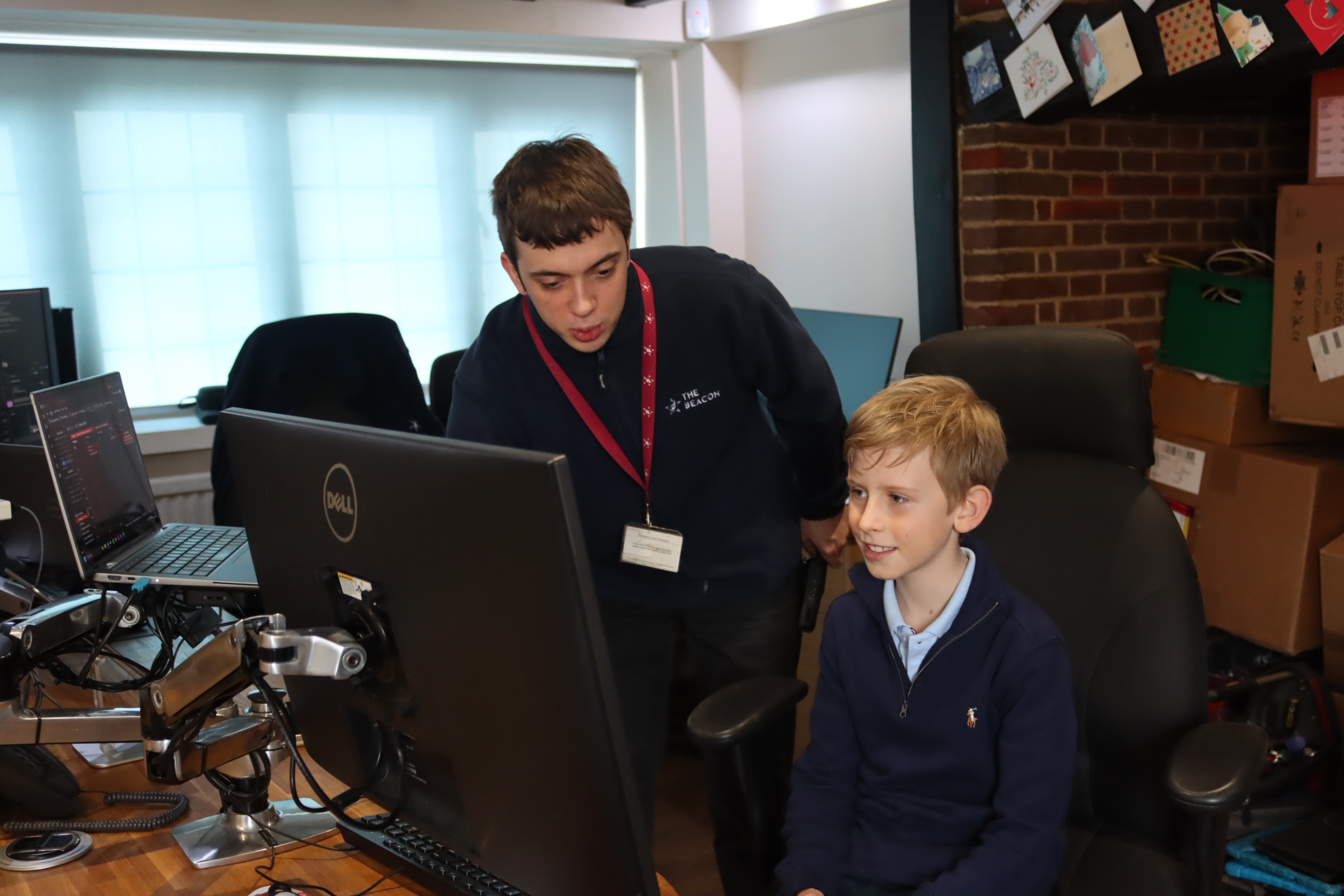 Next, Oscar made a pit stop with the Estates Team, where he kindly shared his home-made cheese on toast and chatted about all things Beacon. After his snack, it was off to IT for a one-to-one session, where he began designing a screen visual to be displayed on our TVs throughout the school.